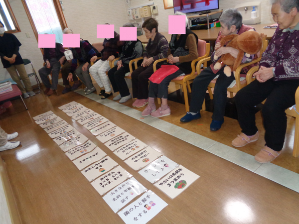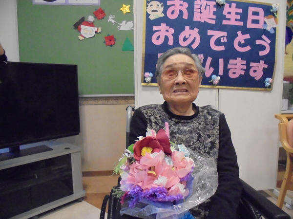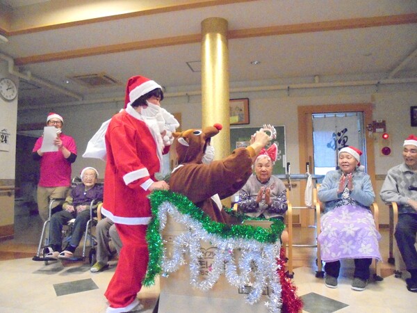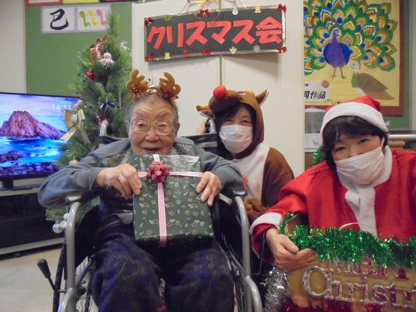 12月24日にクリスマス会を行いました。クリスマスの由来やサンタクロースの由来について物語を読んだり、クリスマスに関する3択クイズをして盛り上がりました。サンタ役を入居者様にやってもらい、プレゼントを渡してもらいました。サンタさんへの質問コーナーでは面白い回答があり、皆様で大笑いしました。