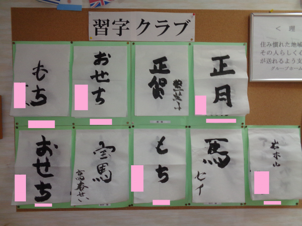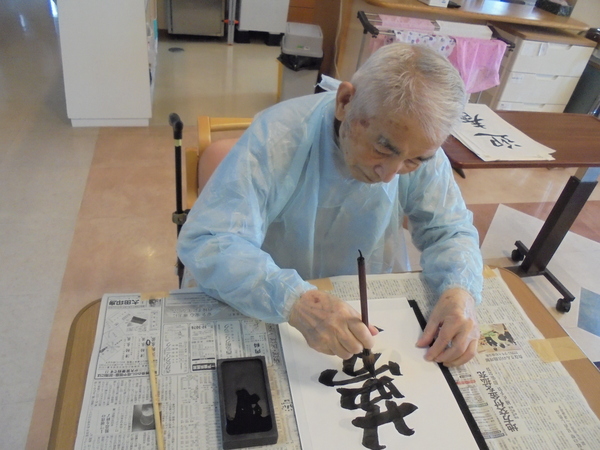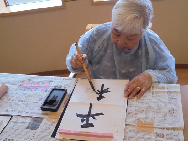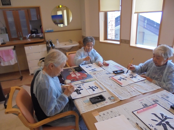 1月3日(土)『書き初め』をしました。一人ひとりお題を選んで頂き、入居者様からは『書道するのは久しぶりだ』『子供の頃を思い出す』など聞かれ、終始和やかな雰囲気で行うことが出来ました。
