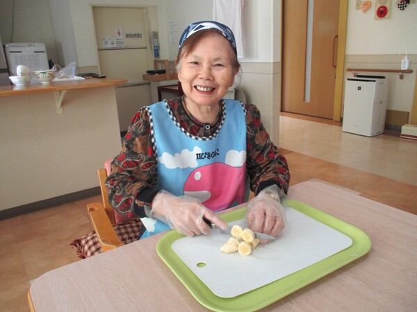 まず始めにバナナをカットしていただきました。慣れた手つきでカメラに笑顔を振りまきながらでもスムーズに切り分けておられ、こちらの心配も吹き飛ばしてしまうほどの余裕っぷりでした。