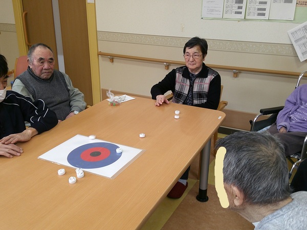 ひな祭りの歌を皆さんで歌った後、「カーリングゲーム」を行いました。