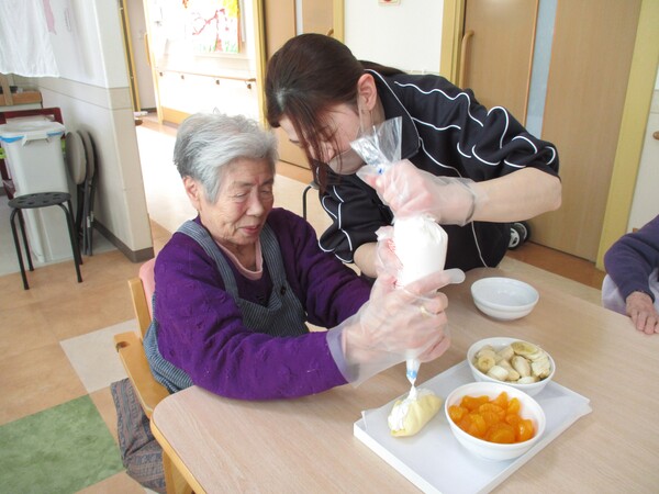 続いて事前に用意した生地にホイップクリームをたっぷりと搾り、その上にバナナとみかんの缶詰を飾り付けて完成です。