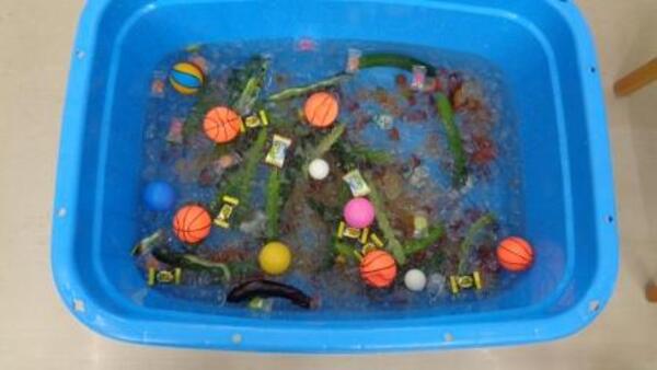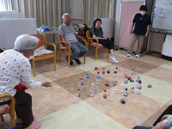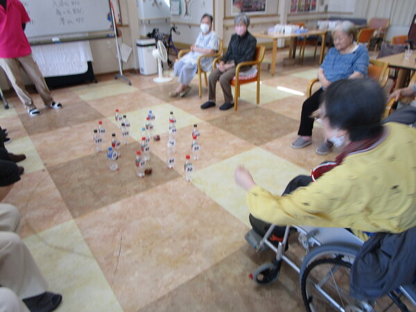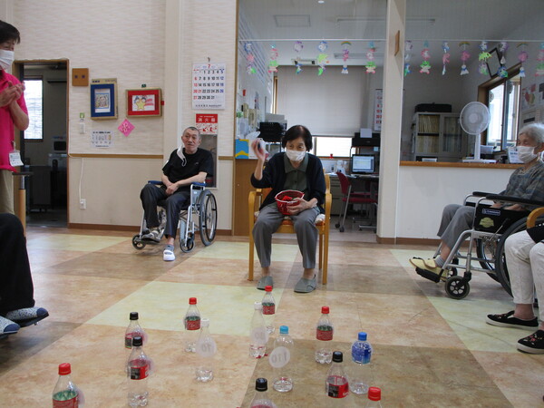 水の入ったペットボトルのピンをお手玉で倒していき、点数を競うゲームです☺
