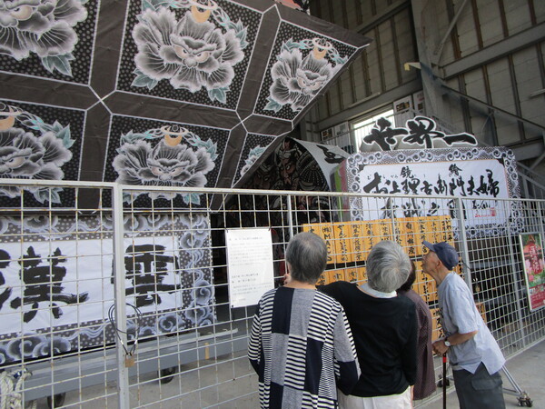 お祭りの季節を前に、絵を張り替えたばかりの世界一の扇ねぷた!
