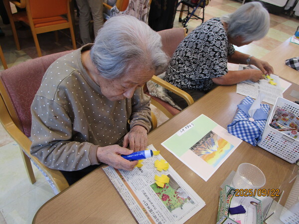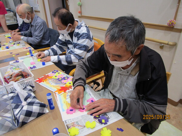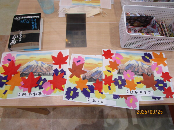 切って貼って作ったもみじとコスモスを岩木山の写真に貼り付けました。