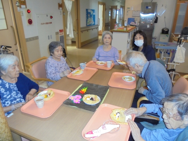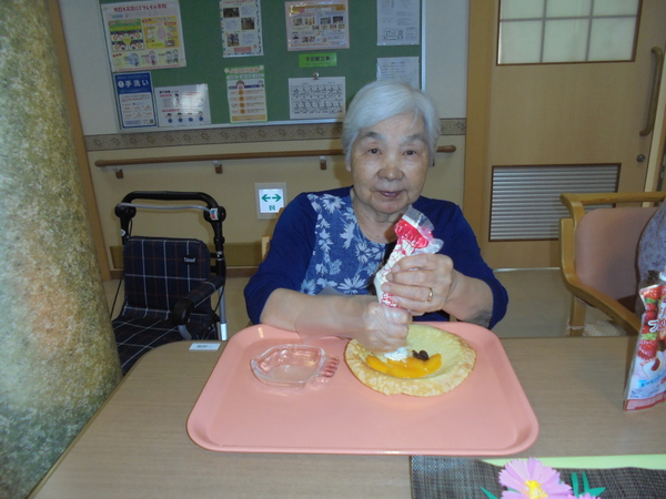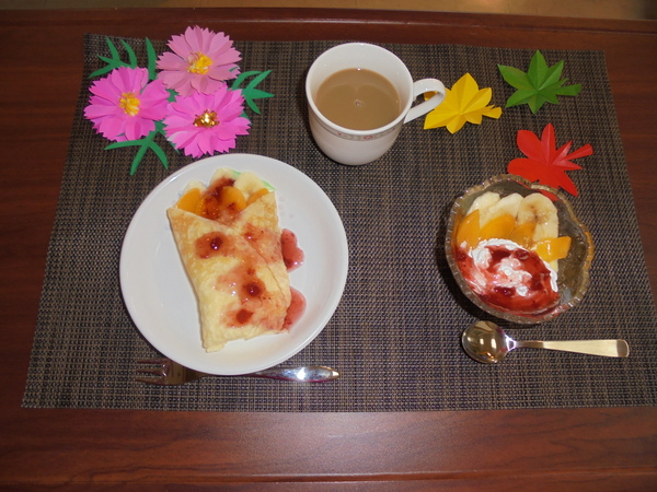 10月8日(水)『フルーツクレープ』を作りました。入居者様、各自個性豊かにフルーツ等を飾付けし、皆様『美味しい〜』『おかわりがほしい〜』と話され喜ばれておりました。(´▽`*)