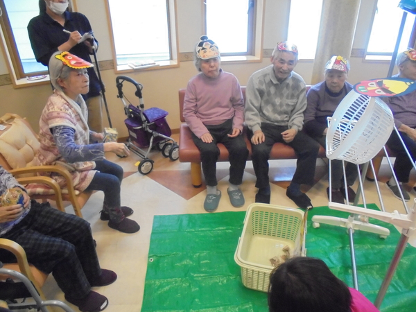 鬼の面が付いてるカゴに甘納豆を投げ、鬼退治ゲームを行いました。