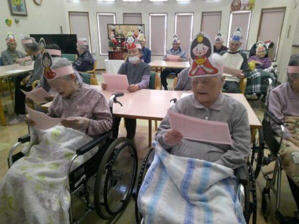 職員からひな祭りの由来を聞き、その後皆でひな祭りの歌を唄いました。
